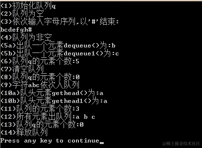 36 cout<<"(10b)队头元素gethead1()为:"<<e<<endl;