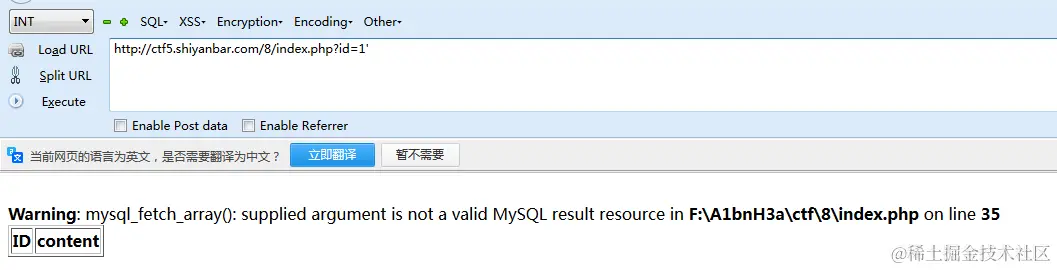 哎,咱们发现一个很有意思的东西,页面报错了,MySQL说明后台数据库的版本暴露出来了,F:\A1bnH3a\ctf\8\index.php是网页的绝对路径,在渗透过程中,这就是一个非常危险的东西,千万不能给别人知道,咱们来试一试这个是不是注入点呢?