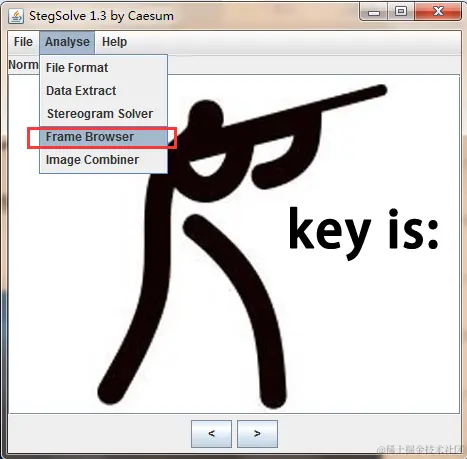 我们得到动图以后,发现key的关键字,大概就能猜测这里面有猫腻,咱们发现这个动图晃得太快了,看不明白,咱们有两种思路,第一种咱们可以利用截图截下来,第二种思路咱们可以利用工具,把图片的帧给分出来,叫StegSolve,这里面有个功能,叫逐帧查看,如图所示:
