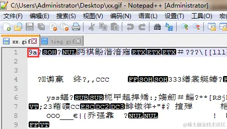 我选择了一幅柯南的图片,咱们同样用Notepad++打开,对比一下这两个图片