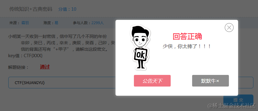 这是我入门密码学开始写的第五道题,大家看到这个东西,肯定会想,传统知识是什么啊,这里写了一堆年份,大家看完题干以后会有点困惑,感觉这个跟古典密码学有什么关系啊,一堆文字啥的,题干中有写到一个甲子,甲子是啥啊,在比赛中不知道的时候,你可以上网去搜~~~