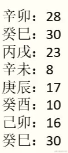 辛卯,癸巳,丙戌,辛未,庚辰,癸酉,己卯,癸巳。\