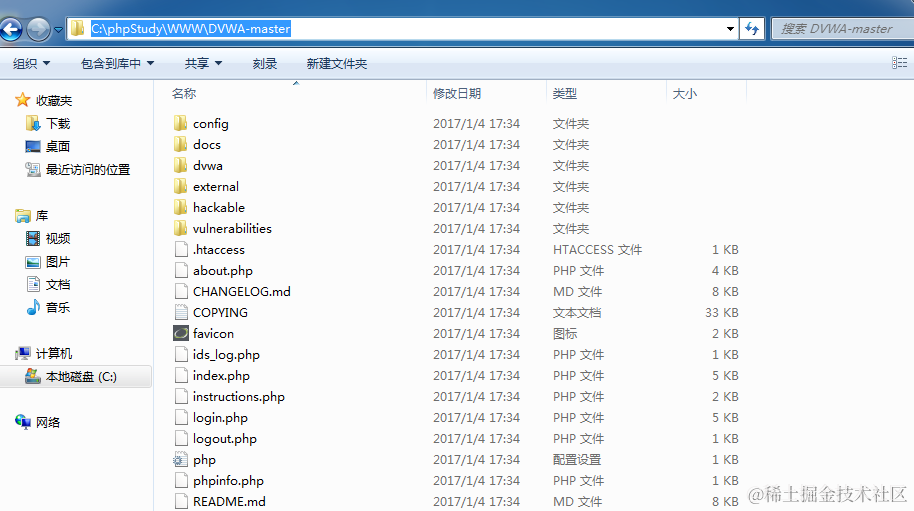把下载好的DWVA的压缩包,放在C:\phpStudy\WWW中(因为我将phpStudy安装在C盘,所以是C:\phpStudy),然后解压DWVA的压缩包。
