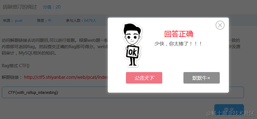 访问解题链接去访问题目,可以进行答题。根据web题一般解题思路去解答此题。看源码,请求,响应等。提交与题目要求一致的内容即可返回flag。然后提交正确的flag即可得分。web题主要考察SQL注入,XSS等相关知识。涉及方向较多。此题主要涉及源码审计,MySQL相关的知识。