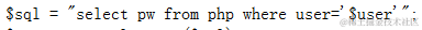 意思是查php里面user字段里面的pw的字段值,这句话的意思是把上一个查询的值放入到query变量中,如果查询的结果不存在,就输出一个错误,如果有的话就打印出Key。。。