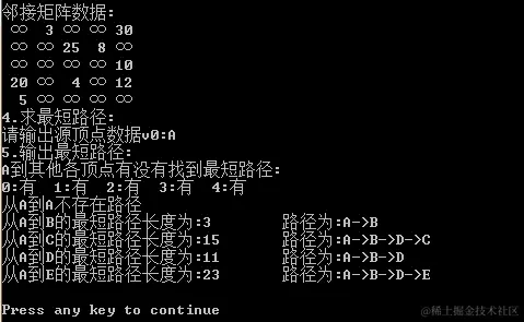 141 printf("从%c到%c的最短路径长度为:%d\t路径为:",g.vexes[v],g.vexes[i],dist[i]);