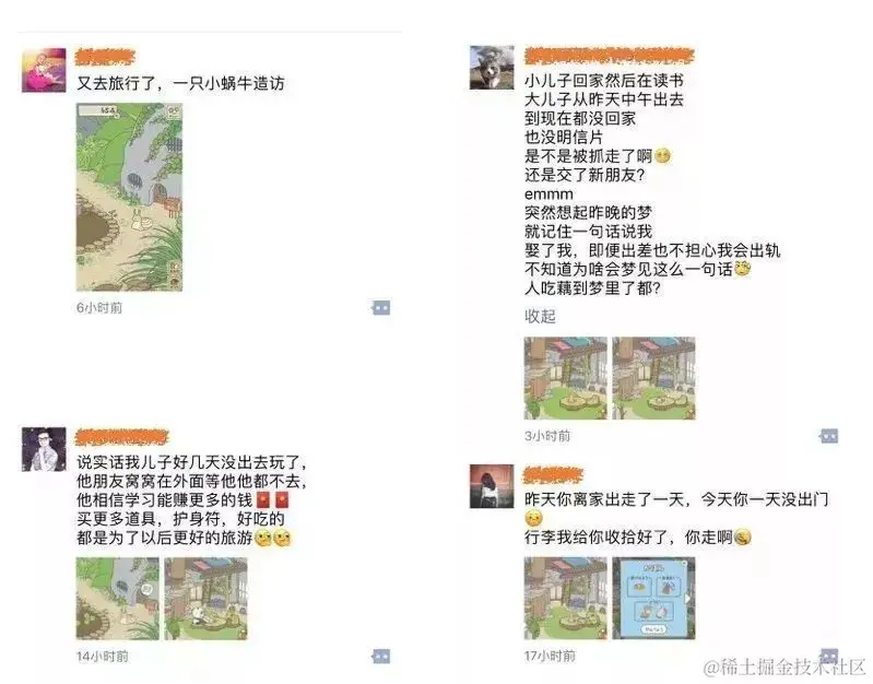 《旅行青蛙》这款游戏机制非常简单,用户只需偶尔摘些三叶草,给蛙换些吃的,再无别他。这只蛙每天除了吃饭、睡觉、看书,也会出去旅行,然后发回一些在外面的图片,但这一切活动均不受用户控制。就是这么简单的游戏,却认很多人感受颇深,她们从这只蛙身上看到了自己成长的影子,体会到了当父母的不易(以及唠叨),她们从对蛙的牵挂,想到了远方的父母,加之此时又是春节临近,看着这只自己吃饭、睡觉、旅行、写信、读书的蛙,思家之情不免愈加浓烈,情绪上的共鸣极大地符合用户的精神需求。