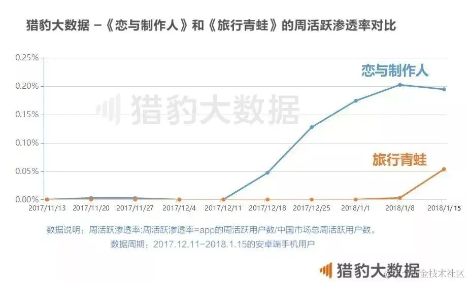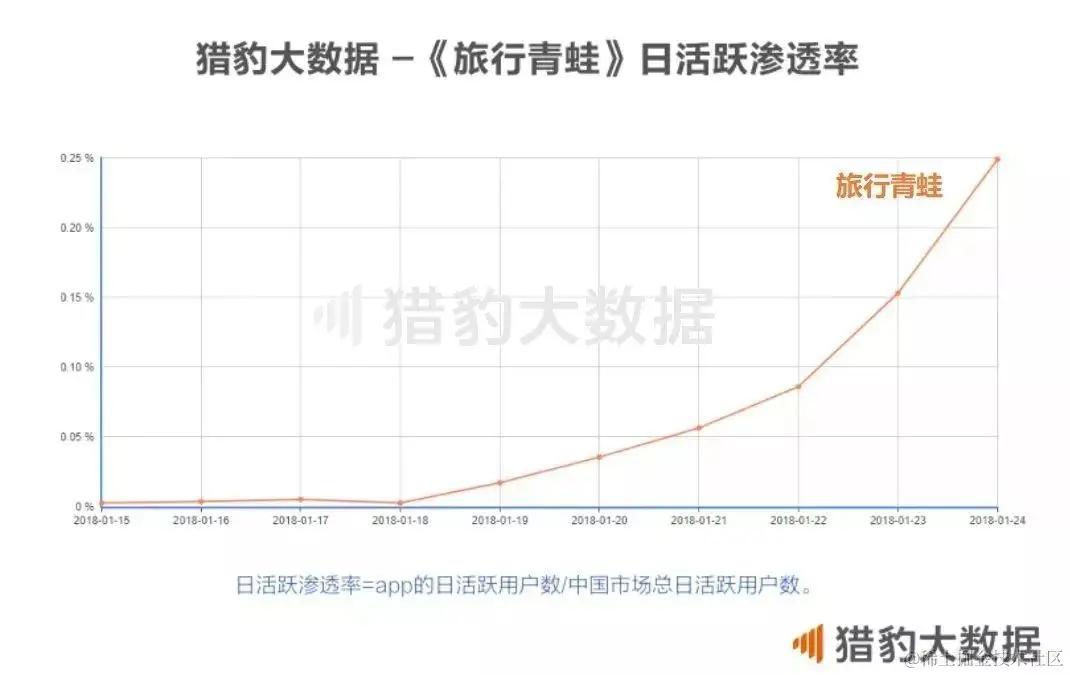 在今年1月,市场上相继出现了三款热门游戏,分别是《恋与制作人》、微信小程序游戏跳一跳和《旅行青蛙》,这其中,《旅行青蛙》出现的最晚,从1月18日开始,《旅行青蛙》开始了爆发性增长,日活跃渗透率直线上升,到目前持续了将近一周时间。