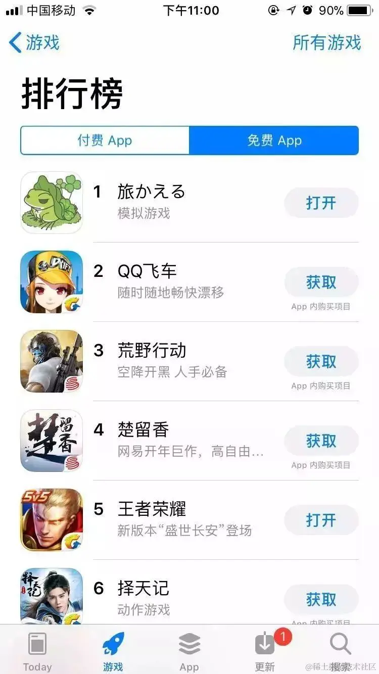 1月21日,《旅行青蛙》一举登顶中国App Store 免费榜,超过了《荒野行动》和《王者荣耀》等游戏。
