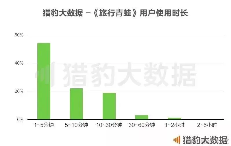 《旅行青蛙》虽然依托社交平台进行了很好的推广,但其自身并没有社交账户体系,用户粘性极低,很多人都是跟风。一般来说,social game的生命周期为6个月左右,随着用户对游戏的熟悉和习惯,一般在6个月左右之后会出现乏味感,然后选择离去,随着移动互联网的发展,这一周期正在不断缩短,很多游戏在一周之后就如流星般陨落,正所谓成也社交,败也社交,本来social game的生命周期就在不断缩短,更不用说《旅行青蛙》这款没有社交账户体系的游戏了。很多人更愿意把《旅行青蛙》划分为放置类游戏,从猎豹大数据看,用户的使用时长占比最多的是1-5分钟,没有社交体系,无需更多的互动,只需要把游戏放在那里,静静的看着他就好,但随着时间的推移,会有越来越多的人离蛙而去。