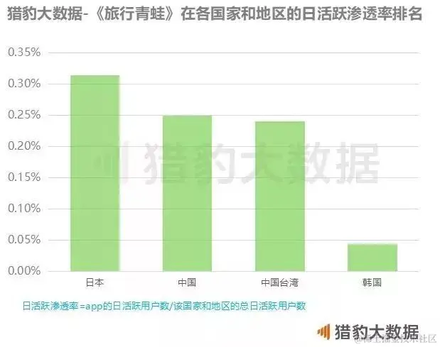 从日活跃渗透率看,《旅行青蛙》目前活跃率最高的是日本,其次是中国和中国台湾,但是由于各国家和地区的移动互联网人口基数的巨大差异,从用户规模上来说,中国的用户数量远远反超日本。