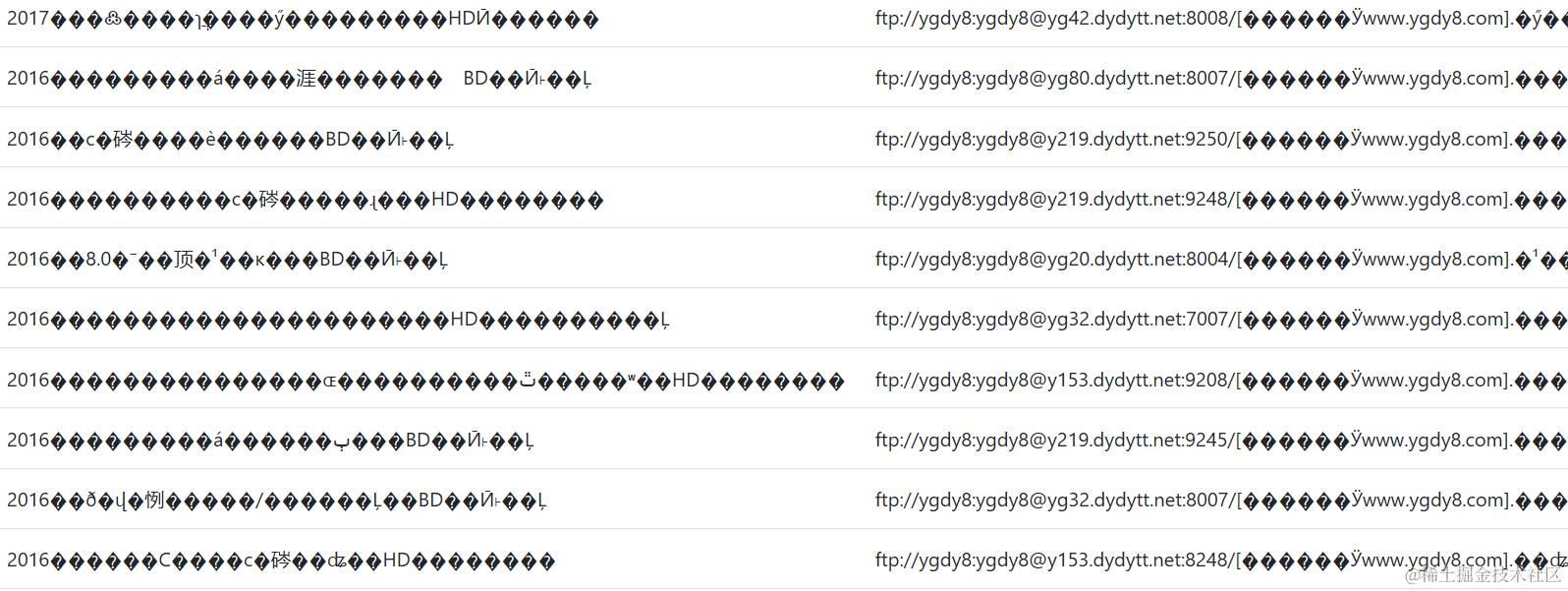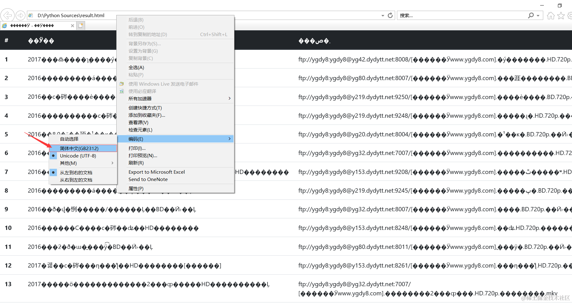 昨天在爬取电影的时候生成的表单打开result.html时,发现页面出现如下乱码: