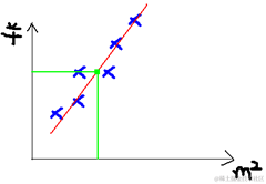 我们可以用一条曲线去尽量准的拟合这些数据,然后如果有新的输入过来,我们可以在将曲线上这个点对应的值返回。如果用一条直线去拟合,可能是下面的样子: