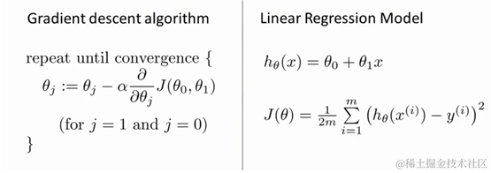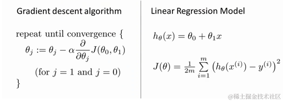 左侧就是梯度下降法的核心内容,右侧第一个公式为假设函数,第二个公式为损失函数。