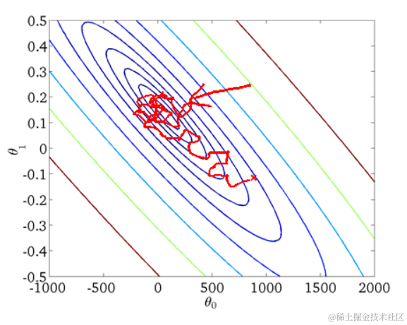 随机梯度下降是通过每个样本来迭代更新一次,如果样本量很大的情况(例如几十万),那么可能只用其中几万条或者几千条的样本,就已经将theta迭代到最优解了,对比上面的批量梯度下降,迭代一次需要用到十几万训练样本,一次迭代不可能最优,如果迭代10次的话就需要遍历训练样本10次。但是,SGD伴随的一个问题是噪音较BGD要多,使得SGD并不是每次迭代都向着整体最优化方向。