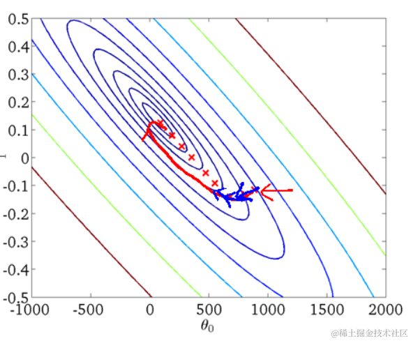 在上面提到梯度下降法的第一步是给θ给一个初值,假设随机给的初值是在图上的十字点。