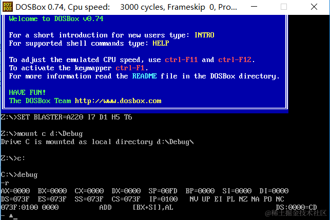 我们需要使用mount命令(用来挂载硬盘或镜像等),将DEBUG.EXE所在的路径挂载到C盘的盘符,以便调用的时候方便直接在同一目录下