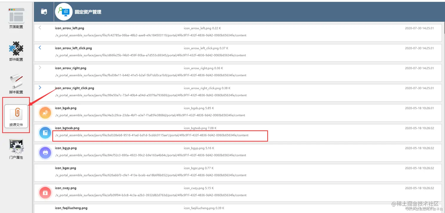 如果新增一个资产类型,可以用已有的图片(即复制已有类型的图片地址),也可自行在“门户管理平台-固定资产管理”的资源文件里上传一个图片,然后在资产类型配置里配上图片地址即可,如下图所示:
