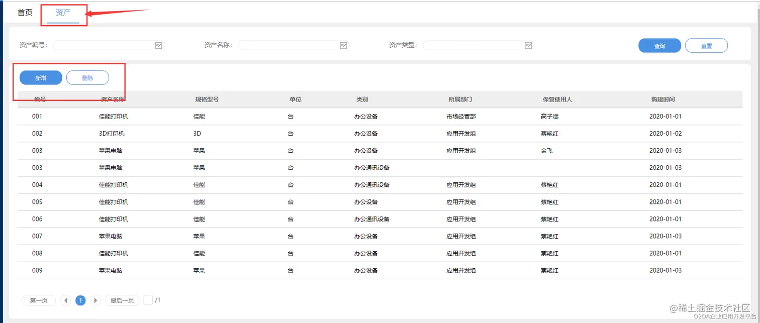 资产页面可以对资产进行单个维护、新增、删除等操作,如下图所示: