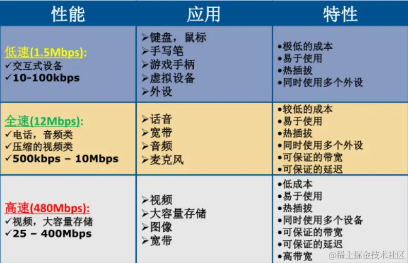 关于USB的特点应用我找了一张图,很清楚的反应了这个问题:
