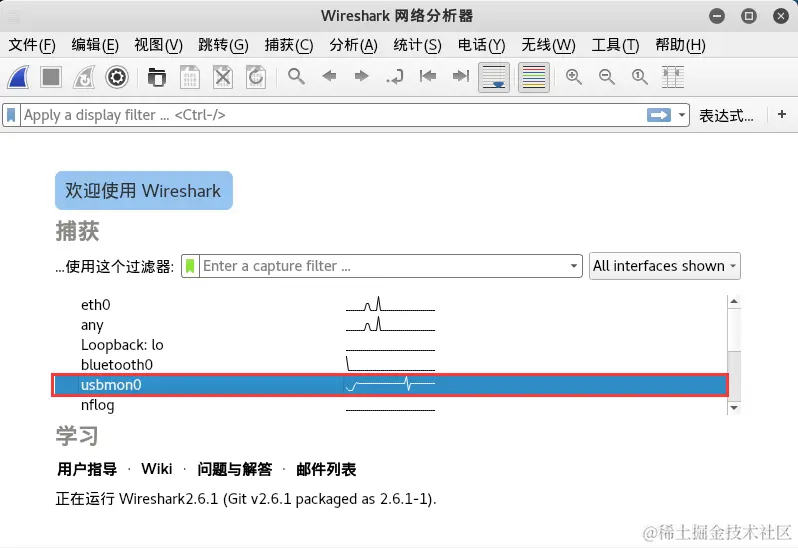 打开wireshark,你会看到usbmonX其中X代表数字。下图是我们本次的结果(我使用的是root):