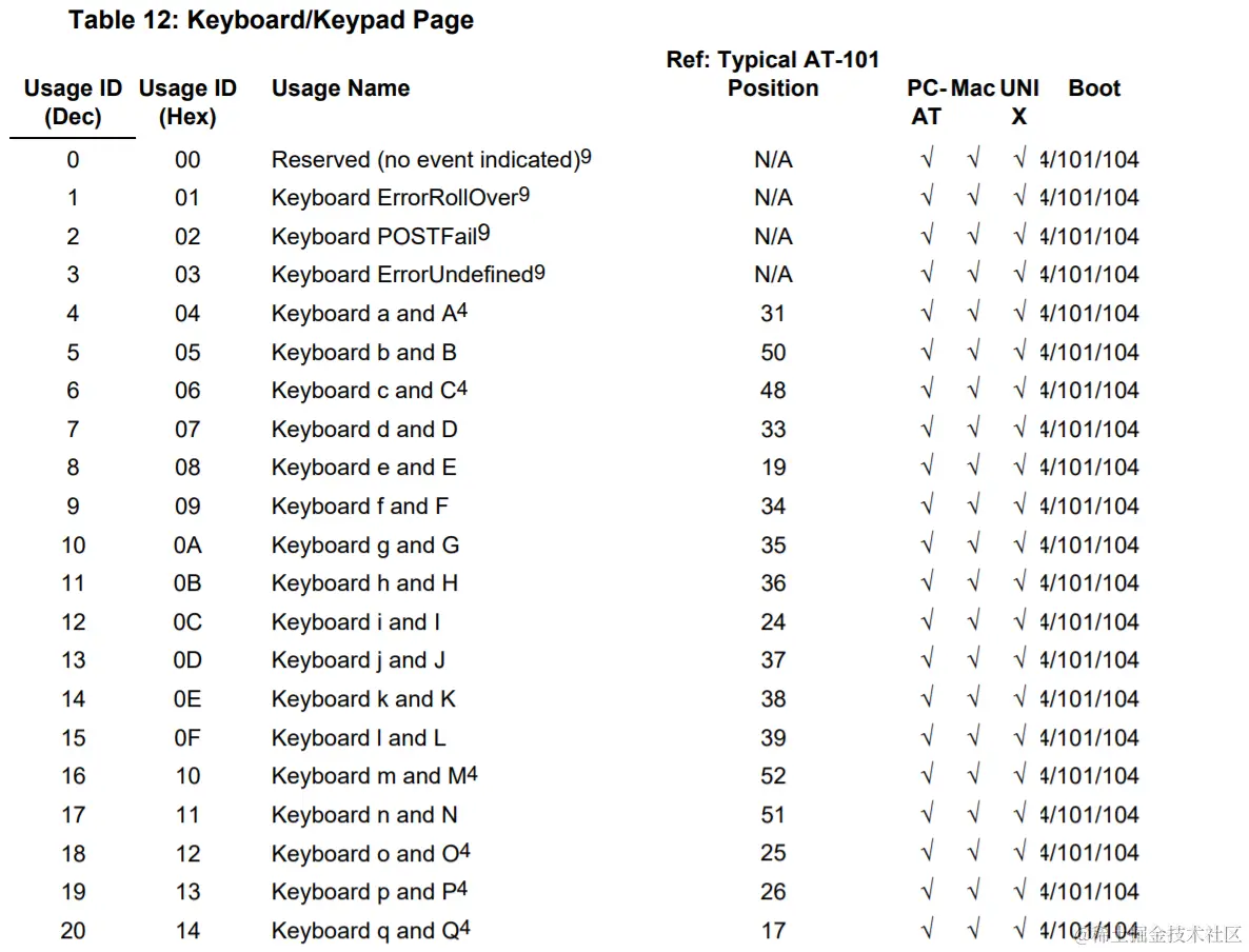 我翻阅了大量的USB协议的文档,在这里我们可以找到这个值与具体键位的对应关系:www.usb.org/developers/…