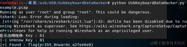 我们分析可以知道,USB协议的数据部分在Leftover Capture Data域之中,在Mac和Linux下可以用tshark命令可以将 leftover capture data单独提取出来,命令如下: