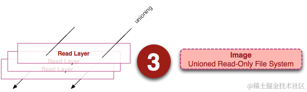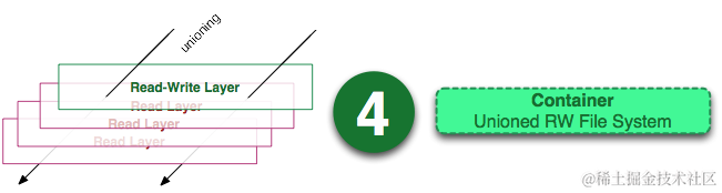 从左边我们看到了多个只读层,它们重叠在一起。除了最下面一层,其它层都会有一个指针指向下一层。这些层是Docker 内部的实现细节,并且能够在主机的文件系统上访问到。统一文件系统 (union file system) 技术能够将不同的层整合成一个文件系统,为这些层提供了一个统一的视角,这样就隐藏了多层的存在,在用户的角度看来,只存在一个文件系统。我们可以在图片的右边看到这个视角的形式。