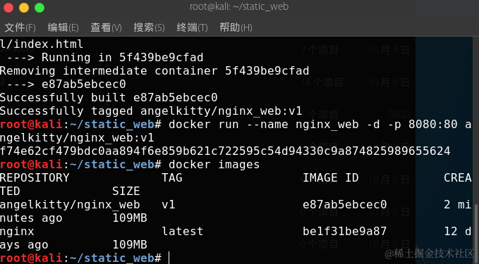 我们解释一下, -t 是为新镜像设置仓库和名称,其中 angelkitty 为仓库名, nginx_web 为镜像名, :v1 为标签(不添加为默认 latest )