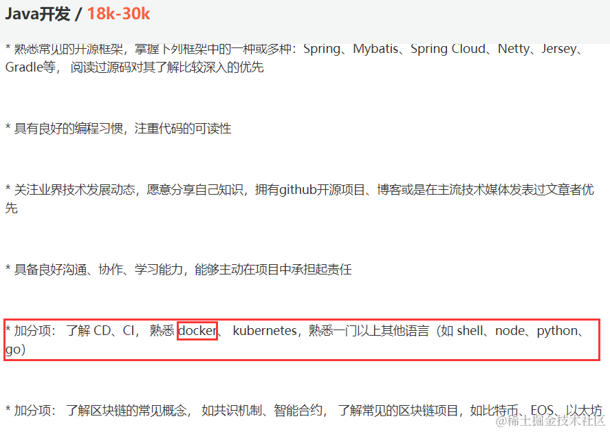 在计算机技术日新月异的今天, Docker 在国内发展的如火如荼,特别是在一线互联网公司, Docker 的使用是十分普遍的,甚至成为了一些企业面试的加分项,不信的话看看下面这张图。