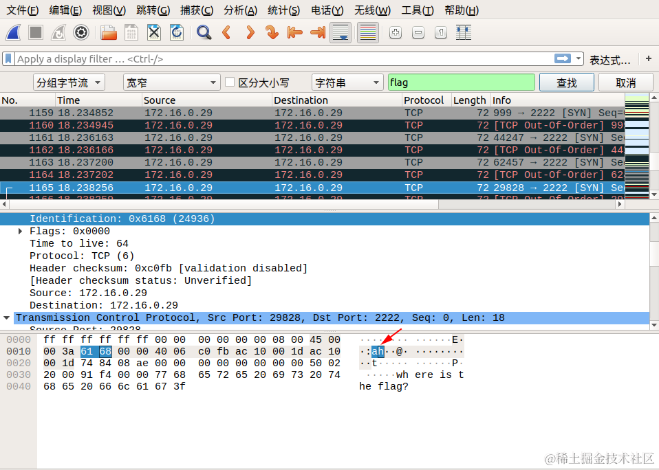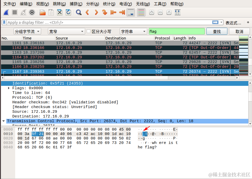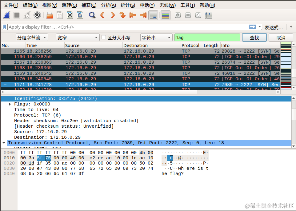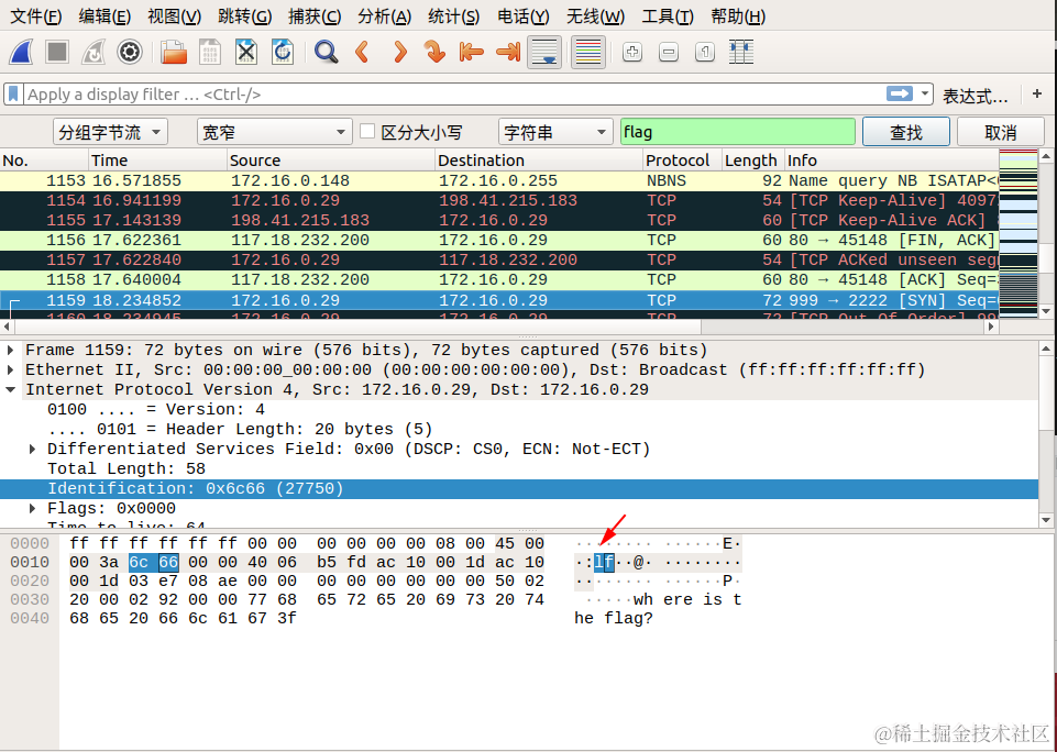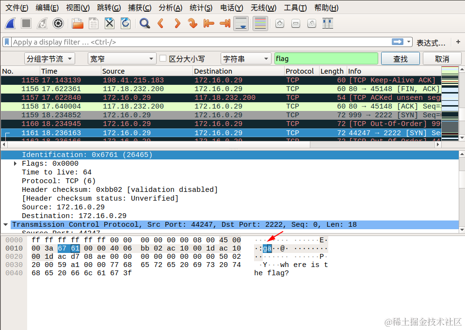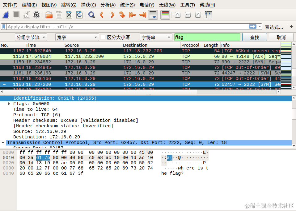 我们直接通过搜索->字符串搜索->分组字节流->搜索关键字 flag 即可,按照同样的方式连接后面相连数据包的 Identification 信息对应的字段,即可找到最终的flag!
