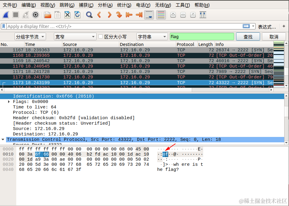 我们追踪到 tcp.stream eq 29 的时候,在 Identification 信息中看到了 flag 中的 lf 字样,我们可以继续追踪下一个流,在 tcp.stream eq 30 的 Identification 信息中看到了 flag 中的 ga 字样,我们发现将两个包中 Identification 信息对应的字段从右至左组合,恰好就是 flag !于是我们可以大胆地猜测, flag 肯定是藏在这里面。