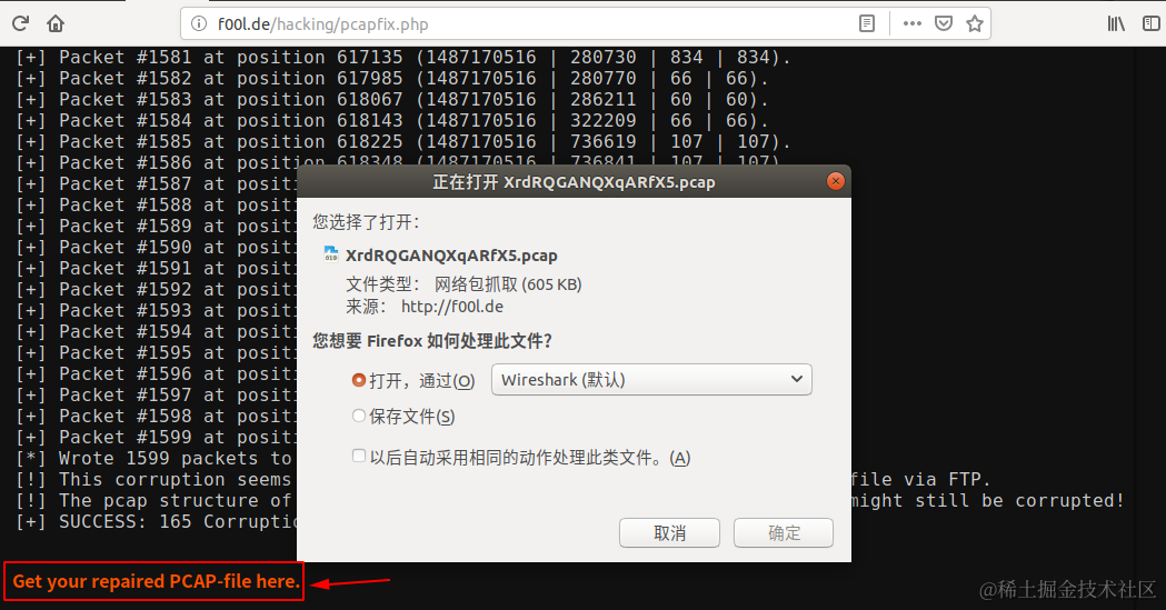 修复完毕后点击 Get your repaired PCAP-file here. 即可下载流量包,然后我们用 wireshark 打开。