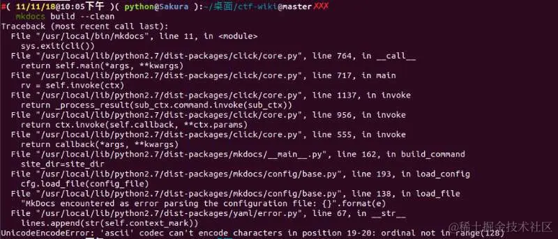 我在修改 ctf-wiki 目录后进行 mkdocs build 去生成索引目录的时候报错: