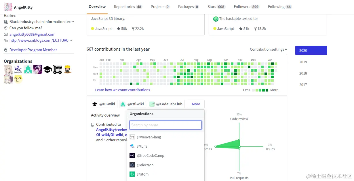 GitHub 的 Followers 从 0 到 899,也是 angular.js、three.js 等多个顶级 star 开源项目的贡献者,虽然只是提交了一行 hello world。