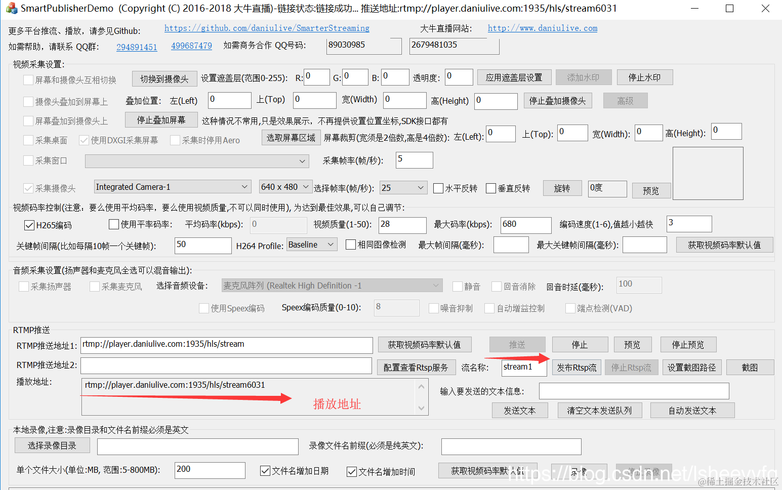 点击推送后,自动生成播放地址,拷贝播放地址,然后打开SmartPlayer.exe, 输入播放地址点击播放即可: