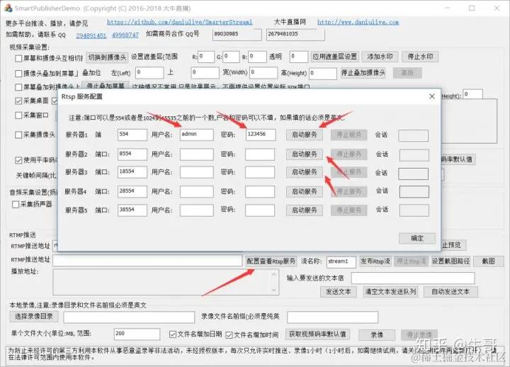 1. 在选择好需要推送出去的音视频数据类型、调整好码率后,点击“配置查看RTSP服务”: