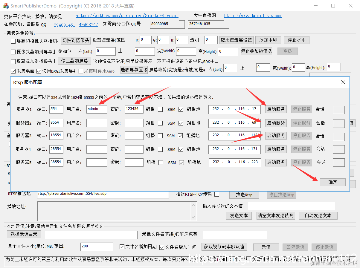 2. 根据需求,可以启动一路或者多路服务,每路服务,并可配置用户名密码信息(可选)。启动服务后,点击“确定”退出设置页面;