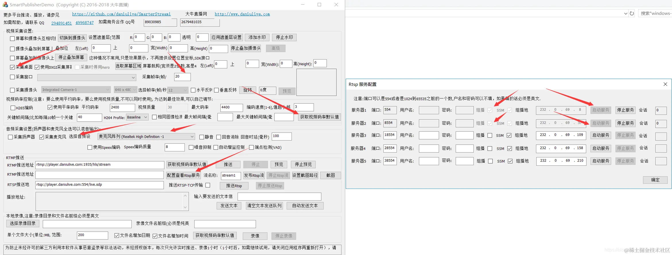1. 设置需要共享的视音频,设置码率后,点击“配置查看Rtsp服务”,选中“组播”和“SSM”选项,点击启动服务即可: