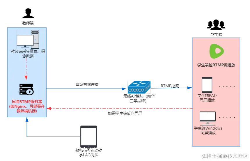 3. 教师端: 如教师有移动的PAD,可以直接推到RTMP服务器,然后共享出去;