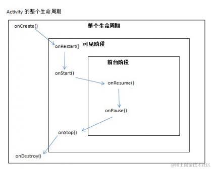 - 开始Activity:在这个阶段依次执行3个生命周期方法:onCreate、onStart和onResume。
