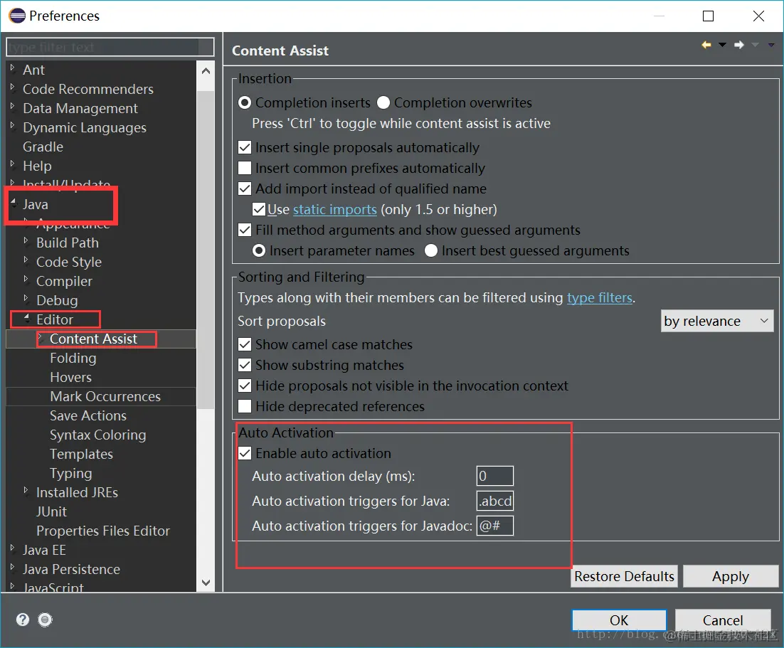 步骤一: 打开eclipse→Windows→Preferences→Java→Editor→Content Assist;修改Auto Activation
