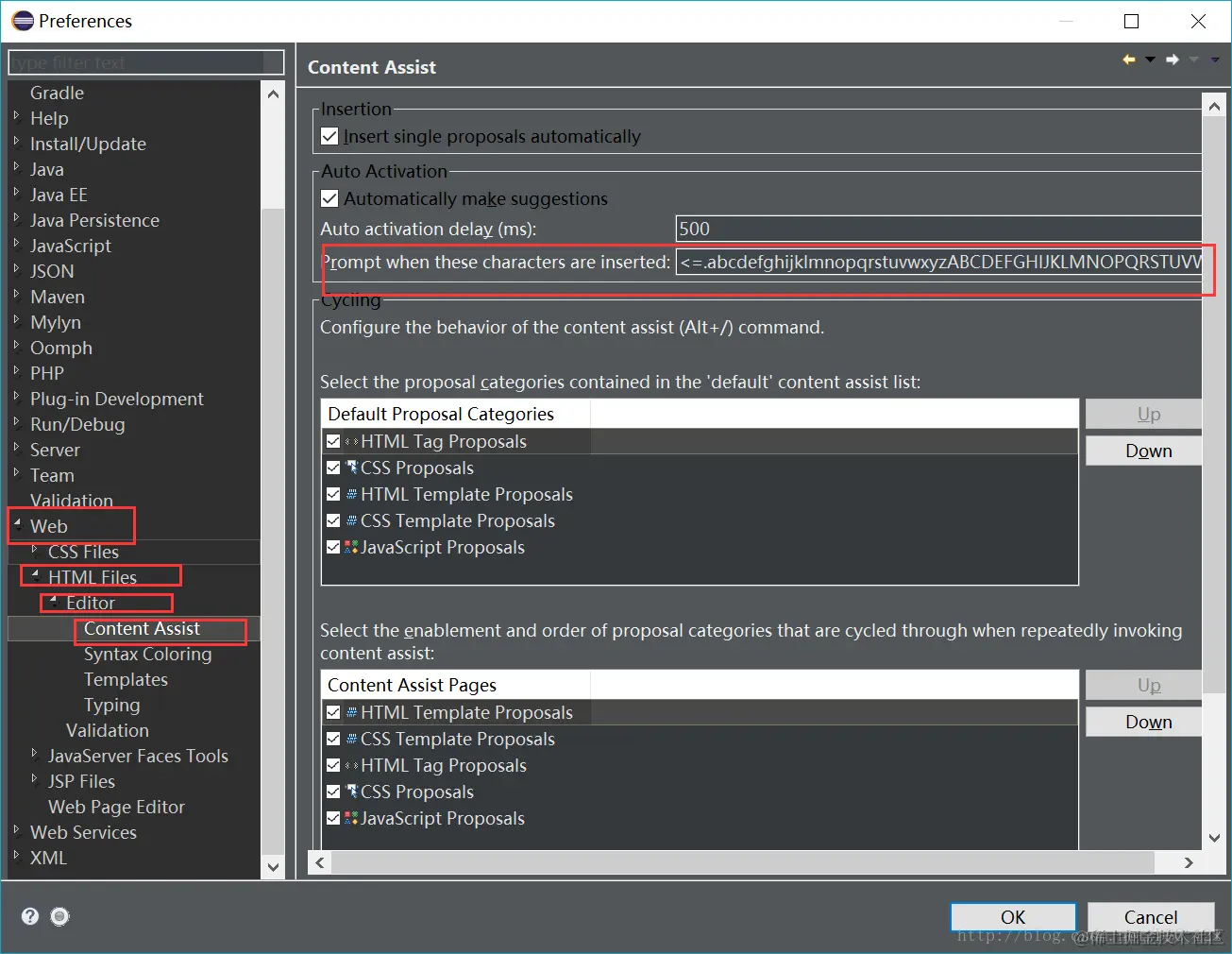 步骤三: 继续打开web→html Files→Editor→Content Assist修改Prompt when these characters