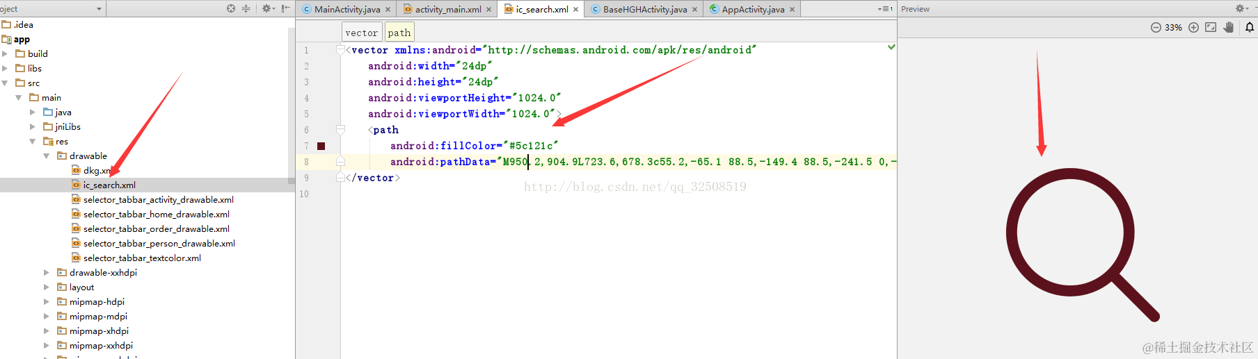 第四步:查看生成的xml文件,可以改变其大小和颜色,右侧是展示区域。可以修改pathdata的数据,达到修改图形的目的。