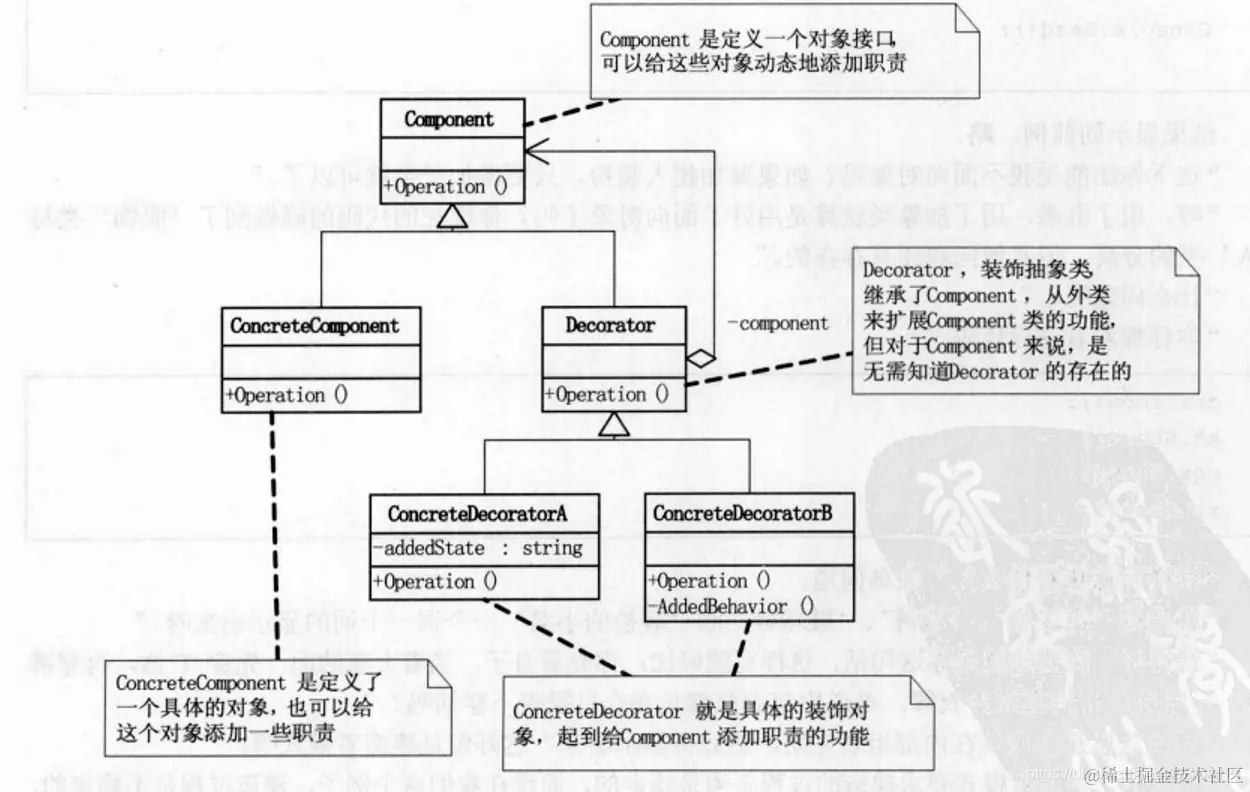 Component是定义一个对象接口,可以给这些对象动态的添加职责。ConcreteComponent是定义一个具体的对象,也可以给这个对象添加一些职责,Decorator,装饰抽象类,继承了Component,从外类来扩展Component类的功能,但对Component来说,是无需知道Decorator的存在,至于ConcreteComponent就是具体的装饰对象,起到了给Component添加职责的功能。当然,有时候要学会活学活用,就比如试衣服的例子中,我们只有人(ConcreteComponent),而没有Component,所以这个时候,我们灵活的将Decorator继承了人(ConcreteComponent)就行了。