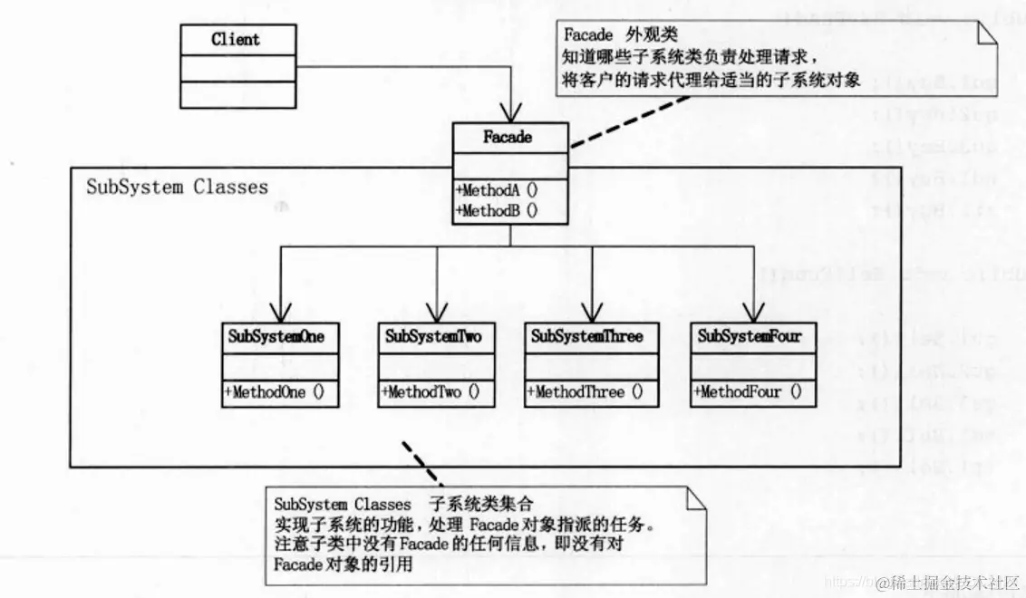 外观模式,为子系统中的一组接口提供一个一致的界面,此模式定义了一个高层接口,这个接口使得这个子系统更加容易使用。在我们设计代码之初,就应该有意识的将不同的两个层分开,在代码开发阶段,增加“外观”可以提供一个简单的接口,减少他们之间的依赖,在维护过程中,为新系统提供一个“外观”,来提供设计粗糙或高度复杂的遗留代码的比较清晰的简单接口,让新系统和外观类对象交互,外观类与遗留代码交互所有复杂的工作。一下是外观模式的结构图