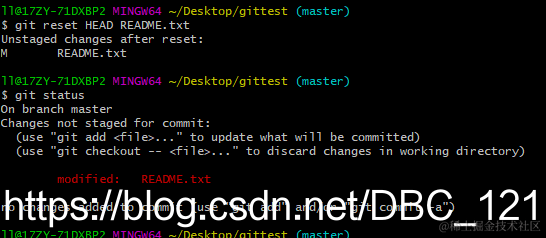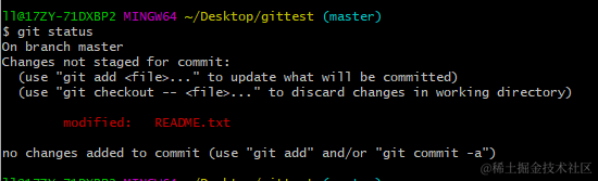 现在我们在在README.txt文件中进行修改,修改之后使用git status指令查看一下当前仓库状态,如图