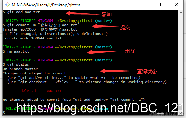status查询了状态会提示说我们刚刚删除了一个文件,这个操作只是在工作区生效,我们还没有将删除操作提交到暂存区,所以这个时候我们需要使用commit命令进行提交仓库。