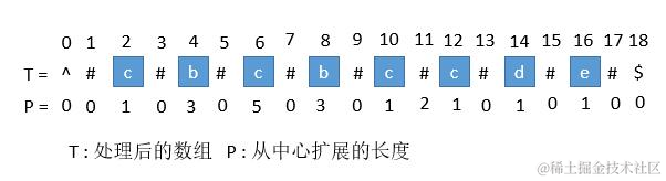 首先我们用一个数组 P 保存从中心扩展的最大个数,而它刚好也是去掉 "#" 的原字符串的总长度。例如下图中下标是 6 的地方,可以看到 P[ 6 ] 等于 5,所以它是从左边扩展 5 个字符,相应的右边也是扩展 5 个字符,也就是 "#c#b#c#b#c#"。而去掉 # 恢复到原来的字符串,变成 "cbcbc",它的长度刚好也就是 5。